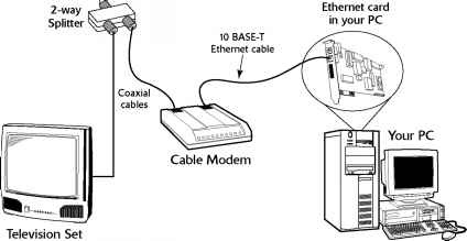 A box called a cable modem is at the heart of Internet access over the cable TV network. The cable modem takes digital data from your PC's Ethernet card and puts in an unused block of frequency (think of it as another TV channel, but instead of pictures and sound, this channel carries digital data). The cable modem places upstream data data that's being sent from your PC to the Internet in a different channel from that used for the downstream data that's coming from the Internet to your PC. By...