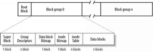 The first block in any Ext2 partition is never managed by the Ext2 filesystem, since it is reserved for the partition boot sector (see Appendix A). The rest of the Ext2 partition is split into block groups, each of which has the layout shown in Figure 17-1. As you will notice from the figure, some data structures must fit in exactly one block, while others may require more than one block. All the block groups in the filesystem have the same size and are stored sequentially, thus the kernel can...
