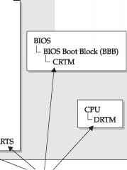 The general architecture of Trusted Computing (see Figure 12-1) revolves around a central component called the Trusted Platform Module (TPM), which is usually implemented as a separate secure chip integrated with the motherboard, but this integration is not a mandatory condition, and the TPM can also take alternative forms such as being a subcomponent of the chipset, a secure chip on a daughterboard, a software emulation, or a virtualized TPM. The TPM is a tamper-evident element that contains the RTS and the RTR, in addition to volatile and nonvolatile memory (and, in particular, a minimum of 16 Platform Configuration Registers (PCRs) that are used to store integrity measurements), cryptographic capabilities (secure hashing HMAC, RSA key generation and storage, RSA encryption and signature, and true random number generation), and opt-in commands in order to enable the use of TPM.