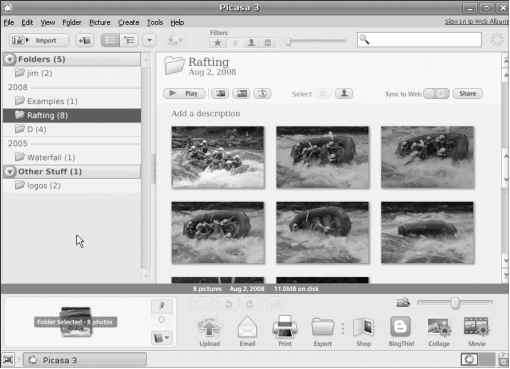 Open Picasa by clicking the Applications menu, selecting the Graphics group and then the Picasa listing. Click Picasa in the fly-out menu, as shown in Figure 8-3. Figure 8-3. The Picasa application can be found in the Graphics application category. Figure 8-3. The Picasa application can be found in the Graphics application category. You might have noticed that installing Ubuntu also installs an application called GIMP Image Editor in the Graphics group (refer to Figure 8-3). Why would you want to download, install, and use Picasa instead of the built-in GIMP Well, one of the main reasons why I recommend Picasa is its simplicity (and the fact that it's free). GIMP is an amazing application, and all the things you can do with Picasa (cropping, removing red-eye, and more) can be done with GIMP, but not as easily (in my opinion). Entire books have been written on using GIMP. (For me, Apress publishes the best book on the subject Beginning GIMP, 2nd Edition, by Akkana Peck.) It's one of...