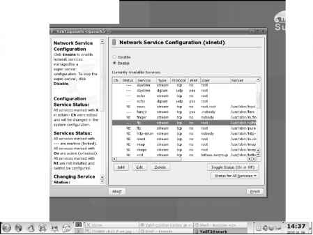 The variety of modules that Webmin includes can be seen from the Networking tab and Servers tab (see Figure 14-10). These include items that have only recently become part of YaST (such as IPsec configuration and HTTP configuration) and others that are still not included in YaST (such as Point-to-Point Tunneling Protocol PPTP server and client, CVS server, MySQL server, and others). Webmin provides a convenient alternative to YaST that you can use from anywhere. In the longer term it would be...
