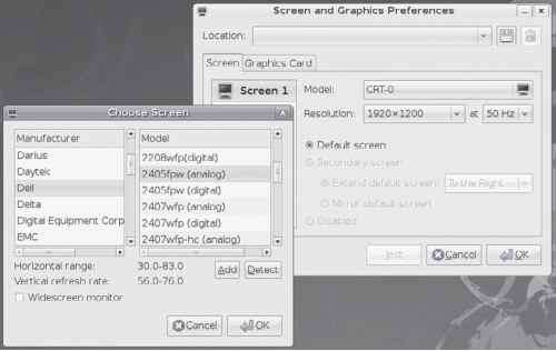 Alternatively, if you are not using a vendor driver, and you have to perform specific configurations such as selecting the correct monitor type, you can manually configure your graphics driver using the Screen and Graphics tool (displayconfig-gtk). Choose System | Administration | Screen And Graphics. The monitor and resolution should be selected automatically (see Figure 4-9).